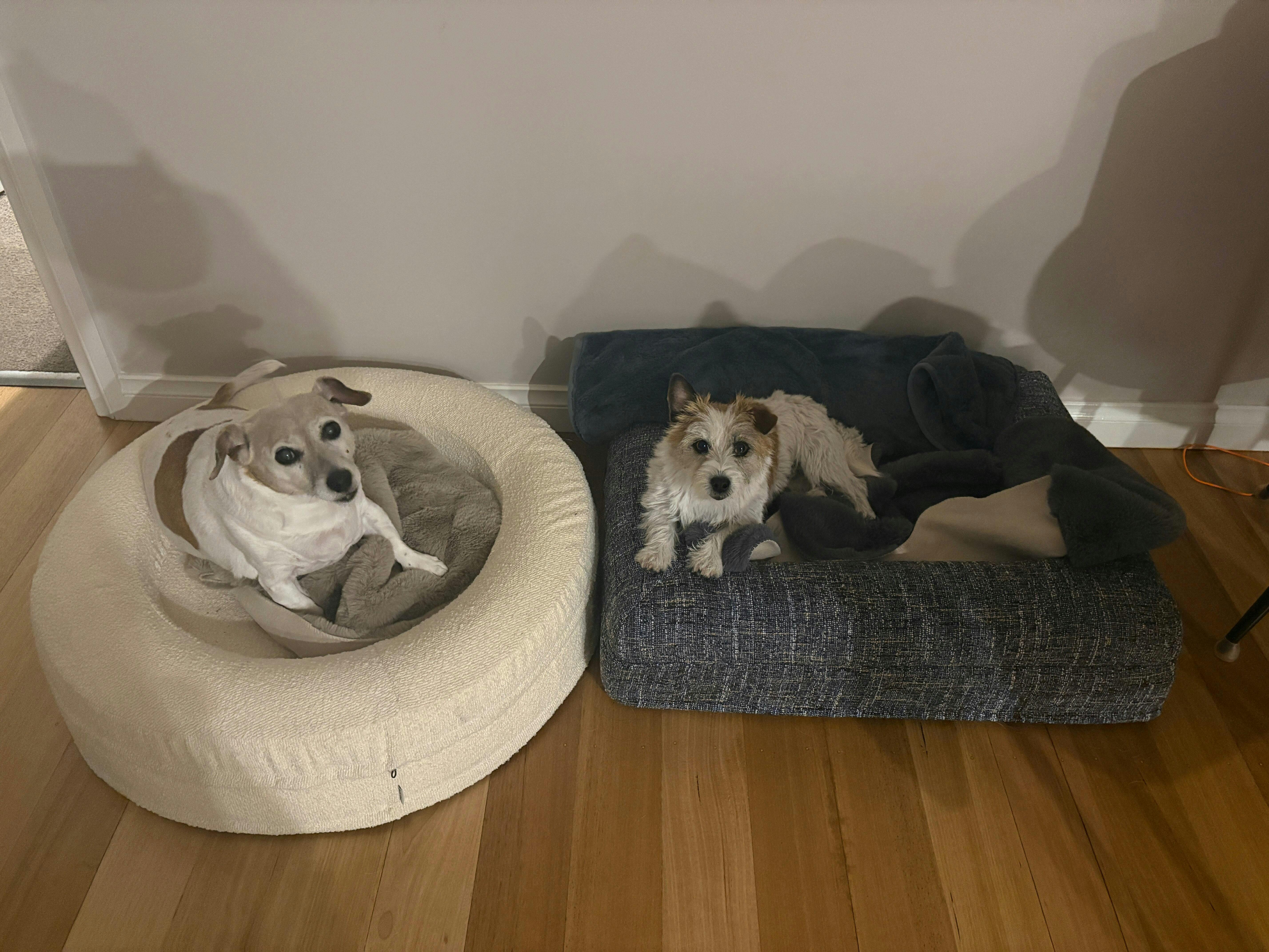 I recently bought two Dazydog beds. An original one and a round one if I had my time again I would probably buy two round ones only reason being for me. They just seem to fit anywhere. Both of the beds are a size small and both my dogs are Jack Russells. Olive and Lexi love their beds. They don’t seem to have a preference but they certainly look forward to getting into them. My older dog is a little bit fussy when it comes to what she sleeps on. She gets a bit stiff and sore, she doesn’t have that problem anymore. I also bought a cover ‘boucle speckle blue’ it is amazing. The pictures don’t do it justice but I really hope and this is my only disappointment, the lack of cover choice for the round beds. I’m sure they are working on it as I post this and I hope they bring a round cover out in the ‘boucle speckle blue’.